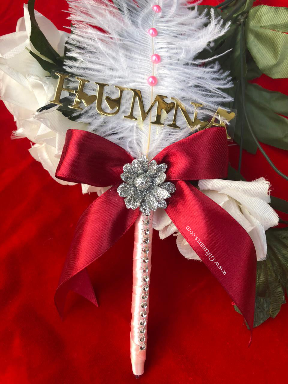This elegant Pink-Themed Pen features white diamantes, a red bow with a silver flower, and a soft white feather decorated with pink beads.