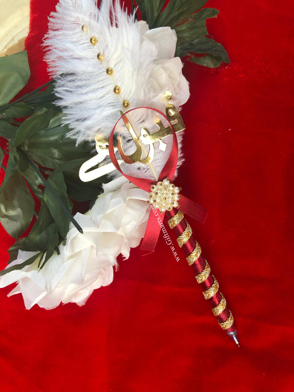 This elegant Red-Themed Pen features golden lace, a red bow with a white beaded flower, and a soft white feather adorned with golden beads.